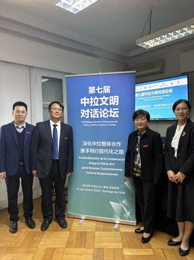 1021日,由中国社会科学院拉丁美洲研究所、江苏省人民政府外事办公室、中国外文局当代中国与世界研究院、拉丁美洲社会科学理事会、拉丁美洲社会科学院等共同主办的第七届中拉文明对话论坛在智利首都圣地亚哥举行。中国驻智利共和国大使牛清报、江苏省人民政府外事办公室主任孙轶、中国社会科学院副秘书长马援、中国社会科学院拉美所党委书记王荣军、江苏师范大学副校长娄峥嵘、江苏师范大学中拉人文交流研究基地执行主任于涛以及智利大学国际问题研究院院长多罗泰娅·洛佩斯等出席开幕式并致辞。来自中国和拉美国家的外交官、专家学者、媒体代表以及工商界人士等嘉宾围绕“深化中拉整体合作,携手同行现代化之路”深入展开主题研讨,为推动新时代中拉全面合作伙伴关系行稳致远贡献智慧和力量。