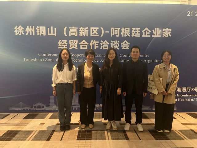 2025年9月28日,徐州铜山(国家高新区)阿根廷企业家经贸合作洽谈会举行,基地与铜山区政府携手阿根廷各界响应“一带一路”倡议,进一步深化中阿友谊、促进经贸合作。徐州市委常委、铜山区委书记、徐州高新区党工委书记龚维芳,阿根廷门多萨省拉瓦列市长代表马迪亚斯·桑托尼,阿根廷门多萨省拉瓦列市长代表马迪亚斯•桑托尼,阿根廷兰苏尔股份有限公司董事长卡洛斯•巴罗索,阿根廷肉类工业商会主席、4073厂董事长里卡多•布鲁泽斯等出席,来自徐州市和门多萨省涉及畜牧业、金融业、新能源等领域的逾200位企业家代表参加活动。