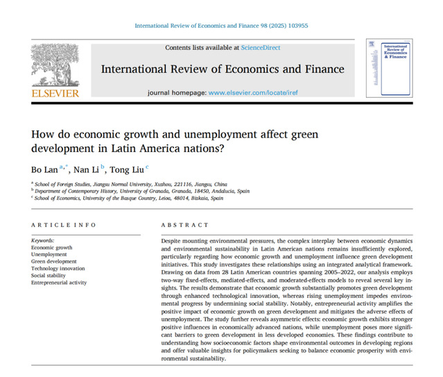 摘要:尽管环境压力不断加剧,拉丁美洲国家中经济动态与环境可持续性之间的复杂互动关系仍未被充分探讨,特别是在经济增长与失业如何影响绿色发展方面。本文采用综合分析框架,对相关关系进行了深入研究。基于2005年至2022年间28个拉丁美洲国家的数据,本文运用了双向固定效应模型、中介效应模型和调节效应模型,揭示出若干关键发现:研究结果表明,经济增长通过推动技术创新显著促进了绿色发展,而失业率上升则通过削弱社会稳定性阻碍了环境进步。值得注意的是,创业活动在其中发挥了放大与缓冲作用——既增强了经济增长对绿色发展的正向影响,又减弱了失业所带来的负面效应。研究还揭示出经济发展水平存在非对称效应:在经济较发达的国家中,经济增长对绿色发展的促进作用更强;而在经济欠发达国家中,失业对绿色发展的阻碍更为显著。上述发现有助于深化我们对社会经济因素如何塑造发展中地区环境绩效的理解,并为政策制定者在实现经济繁荣与环境可持续之间寻求平衡提供了宝贵参考。